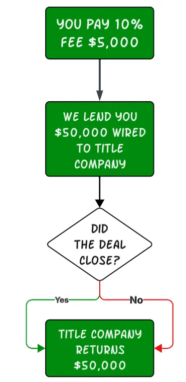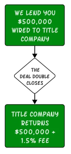 If your deal matches this structure, we will fund the down-payment for the first transaction until it is replaced with the money the seller is willing to finance to you after the purchase as agreed.
